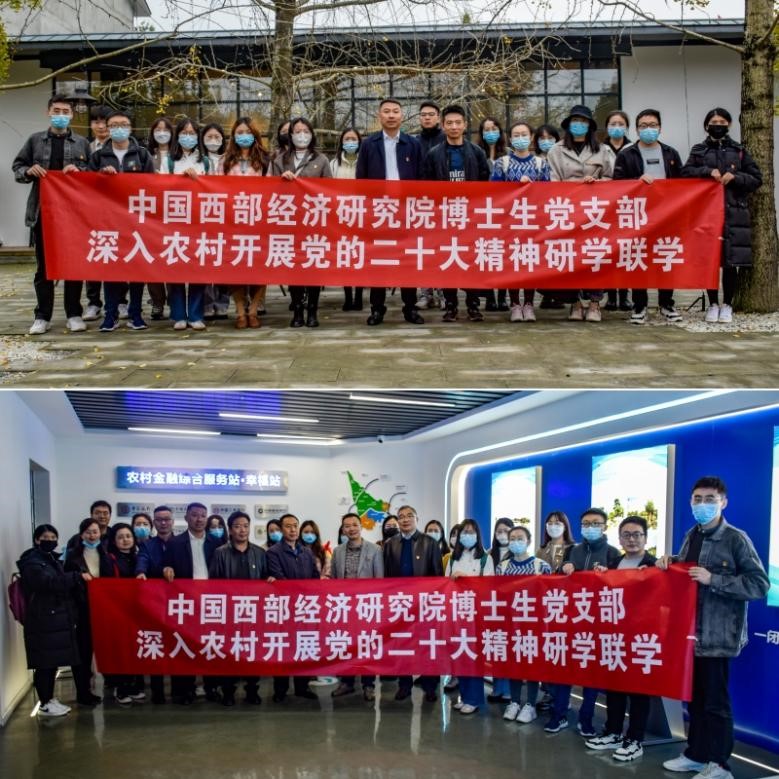 博士研究生党支部深入农村,并与中国人民银行温江支行党支部、成都市温江区财政局机关党委、成都市温江区农业农村局机关党委和中国农业银行成都温江支行党委开展了一次党的二十大精神研学联学活动,取得良好的学习效果。