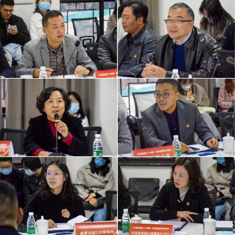 院长贾晋,中国人民银行温江支行党组书记、行长陈家毅,温江区农业农村局党组成员、副调研员黄凤华,温江区财政局机关党委书记万文杰及中国农业银行成都温江支行行长王旭陟等分别结合温江区的农村金融改革成效和经验、农村产权改革进程、财政支持乡村振兴、金融服务乡村振兴等实践案例、创新思路等方面作了交流。大家表示,将认真学习贯彻党的二十大精神,以四川省成都市普惠金融服务乡村振兴改革试验区建设为契机,共同携手努力把温江建设成为普惠金融改革示范区,为新时代新征程普惠金融促进乡村振兴提供西财智慧和温江经验。