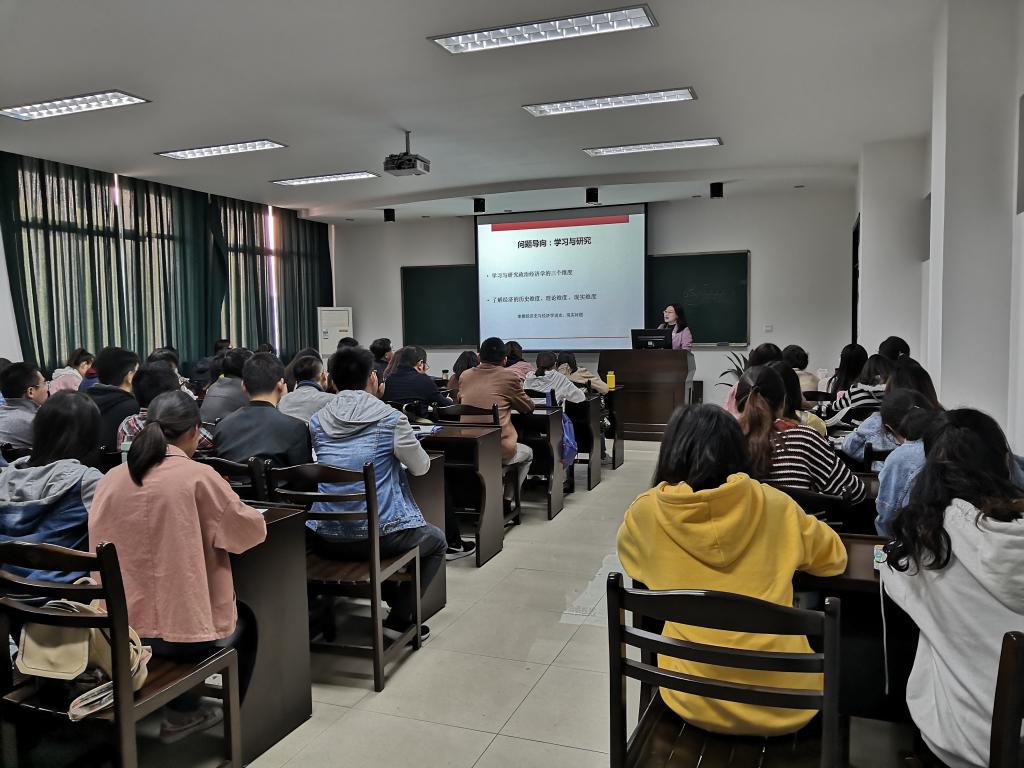 杨静教授首先讲述了政治经济学的产生与发展过程,重点介绍了威廉·佩第、亚当·斯密、大卫·李嘉图等古典经济学代表人物的著作与主要观点。随后,介绍马克思主义经济学的形成及在中国的发展演变,鼓励大家学习马克思恩格斯实事求是、博览群书、刻苦钻研、一丝不苟的研究精神和研究方法。最后,以“政治经济学与政治是什么关系?”“政治经济学是科学还是意识形态?”两个启发性思考题结束了报告。