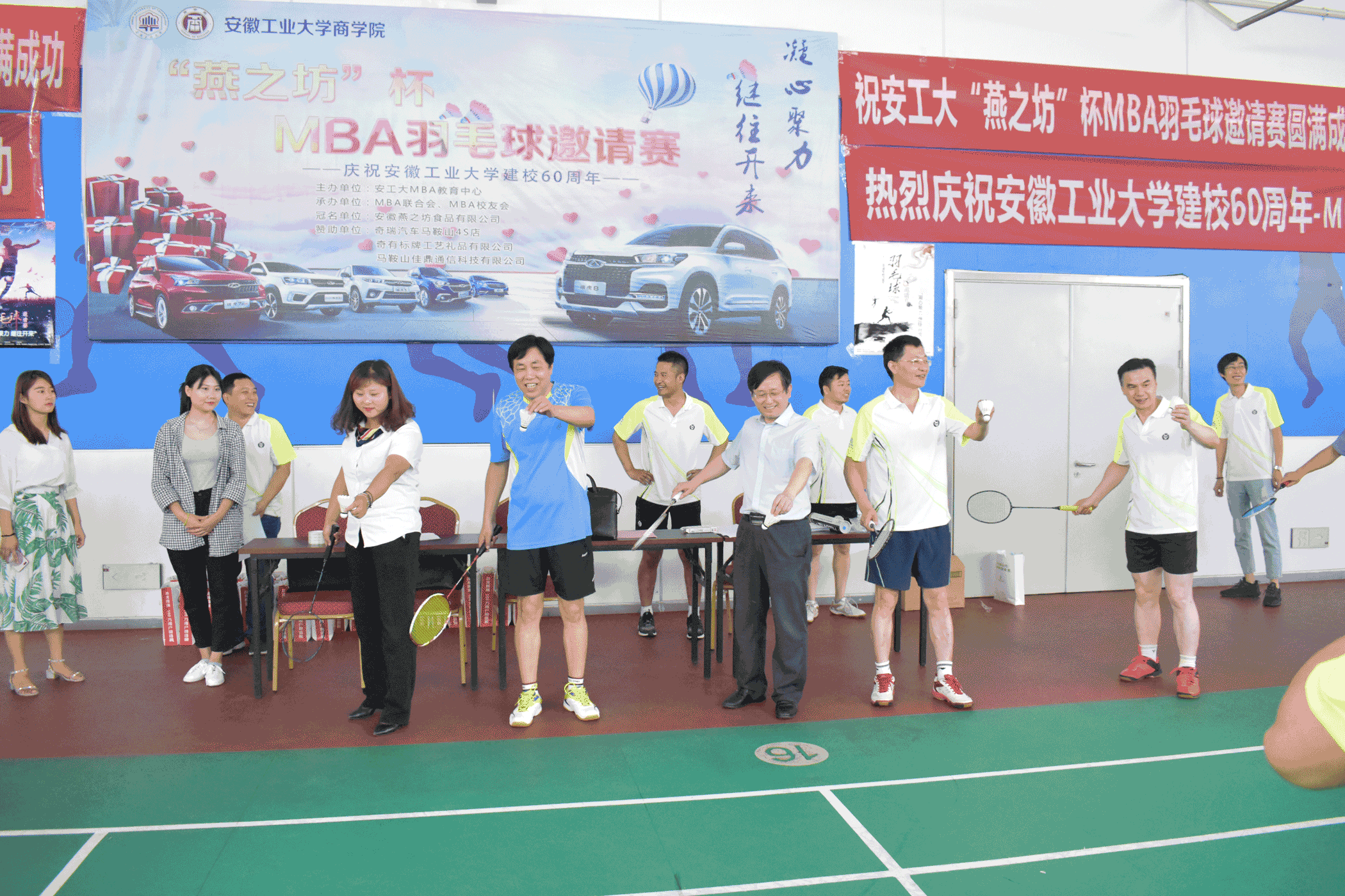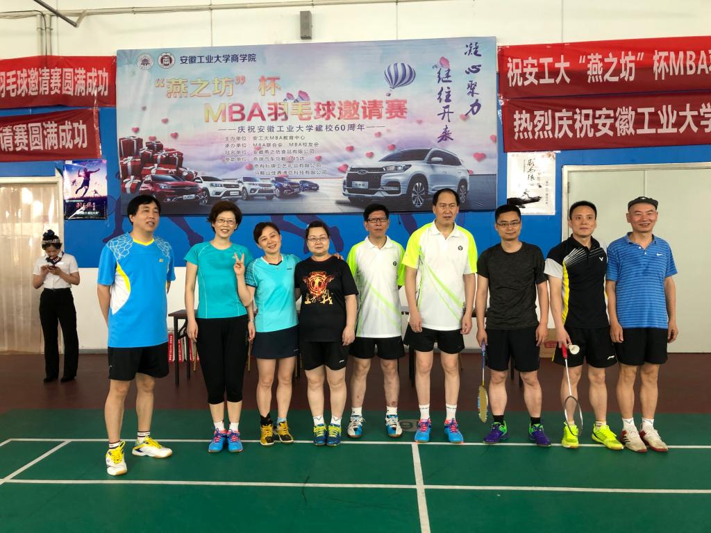 60周年校庆,传承文化底蕴,弘扬优良传统,展示办学成就,扩大社会影响,MBA教育中心以羽毛球邀请赛为载体,凝聚校友力量,丰富师生业余生活,促进MBA学员和学员单位之间广泛交流,现由MBA教育中心主办,MBA校友会&MBA联合会共同承办“凝心聚力继往开来”“燕之坊”杯MBA羽毛球邀请赛,比赛于2018年6月24日在奥体爱玛会羽毛球馆(安工大东校区)举行,应邀参加本次比赛的十支队伍分别是安徽MBA代表队,安工大教工代表队,博彩通