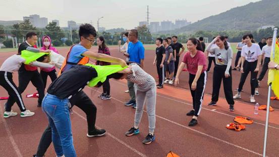 “五星连珠”项目需要每组队员五人一组,背靠背,运送圆球。手挽手、背靠背是给予彼此的信任,拉开手与手之间的距离是给予每个人独立的空间,才能保持团队行稳致远。
