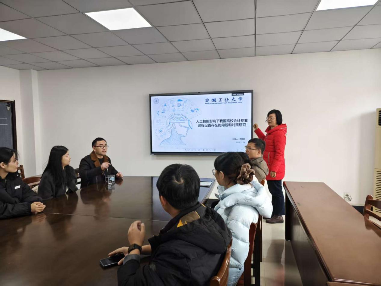 周媛媛博士以“人工智能影响下我国高校会计专业课程设置存在的问题与对策研究”为题分享了研究成果。她系统梳理了人工智能在会计领域的发展历程及融合现状,结合社会对会计人才需求的变化趋势,分析了人工智能对我国高校会计教育与实践的影响,以及其对专业课程设置提出的新要求。在此基础上,针对当前高校会计专业设置的现状,提出了具操作性的优化建议。随后,武优勐书记与牛艺琳博士分别从研究的问题导向、对策的实践可行性、论证逻辑的严密性等方面对论文进行了细致点评,与会师生也积极参与交流。
