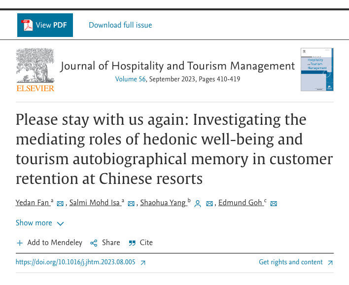 行为科学与政策协同交叉创新团队杨少华副教授,与马来西亚理工大学、澳洲邦德大学研究人员合作,揭示了旅游酒店顾客保留的微观心理规律,相关成果发表在《Journal of Hospitality and Tourism Management》(简称JHTM)。JHTM是澳大利亚旅游与旅游教育委员会的官方杂志,旅游与休闲管理学科的国际权威学术期刊。该期刊是SSCI一区最新影响因子为8.3,在ABDC国际期刊排名A类。博彩通