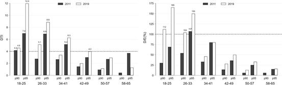 (按年龄组划分的DTI和D/E比率第90和第95百分位的变化)