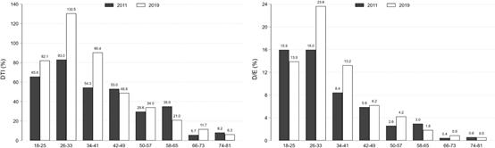 (按年龄组划分的平均D/E和DTI比率)