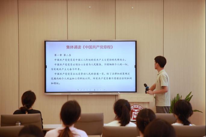 学生党员代表李天乐带领全体党员逐字逐句研读《中国共产党章程》第一章第二条和第三条。第二条明确“中国共产党党员是中国工人阶级的有共产主义觉悟的先锋战士”,强调党员需全心全意为人民服务,为实现共产主义奋斗终身;第三条详细列举党员“认真学习马克思列宁主义”“贯彻执行党的基本路线”“密切联系群众”等八项义务。与会党员结合自身经历,围绕“如何以党章为镜,践行党员标准”展开讨论,进一步深化对党员身份的认知与责任担当。