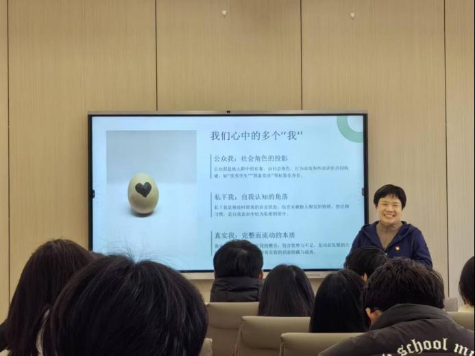 动以“身份拼图”互动开篇,引导学生党员梳理多元自我认知,打破单一角色局限,深化对自我完整性的认知。核心环节中,梅老师从“特质重构”心理学视角出发,辩证解读“缺点”的另一面,帮助学生党员建立积极自我认知,缓解成长焦虑。针对学生党员“先锋模范”责任带来的压力,梅老师结合实际场景分享心理调适技巧,倡导在责任担当与自我关怀间实现动态平衡,助力党员灵活切换角色、筑牢心理根基。