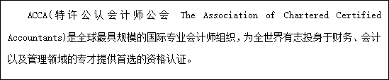 ACCA自1904年成立,作为最早进入中国的国际专业会计师组织,ACCA目前在中国拥有超过25,000名会员及超过108,000名学员(大陆地区7000人),并在北京、上海、成都、广州、深圳、沈阳、青岛、武 汉、长沙、香港及澳门共设有 11 个办公室。 ACCA课程全面、完善及先进兼备,现已被联合国采用作为全球会计课程的蓝本,是全球适用范围最广、认可程度最高的会计师专业资格之一,有财会行业的“MBA”之称。
