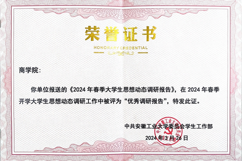 2024 年春季新学期大学生思想动态调研报告》荣获“优秀调研报告”荣誉称号。